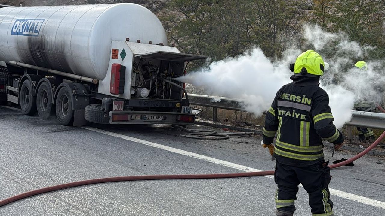 Pozantı-Ankara Otoyolu Akçatekir mevkisinde Pozantı yönünde ilerleyen 46 ADJ 387 plakalı karbondioksit taşıyan tankerde sabah saatlerinde bilinmeyen nedenle yangın çıktı. Alevleri fark eden sürücü aracı emniyet şeridinde durdurup 112 Acil Çağrı Merkezi’ne bilgi verdi. İhbar üzerine bölgeye Mersin Büyükşehir Belediyesi İtfaiye Dairesi Başkanlığına bağlı Tarsus Grup Amirliği ve polis ekipleri sevk edildi. Polis ekipleri, bölgeyi güvenli hale getirmek amacıyla yolu trafiğe kapatarak gerekli emniyet tedbirlerini aldı. Ters yönden kontrollü şekilde bölgeye ulaşan itfaiye ekipleri, yüksek patlama riski taşıyan tankere müdahale etti. Alevleri söndüren ekipler, soğutma çalışması yaptı. Patlama riskinin ortadan kalkmasının ardından bölgede trafik yeniden ulaşıma açıldı.