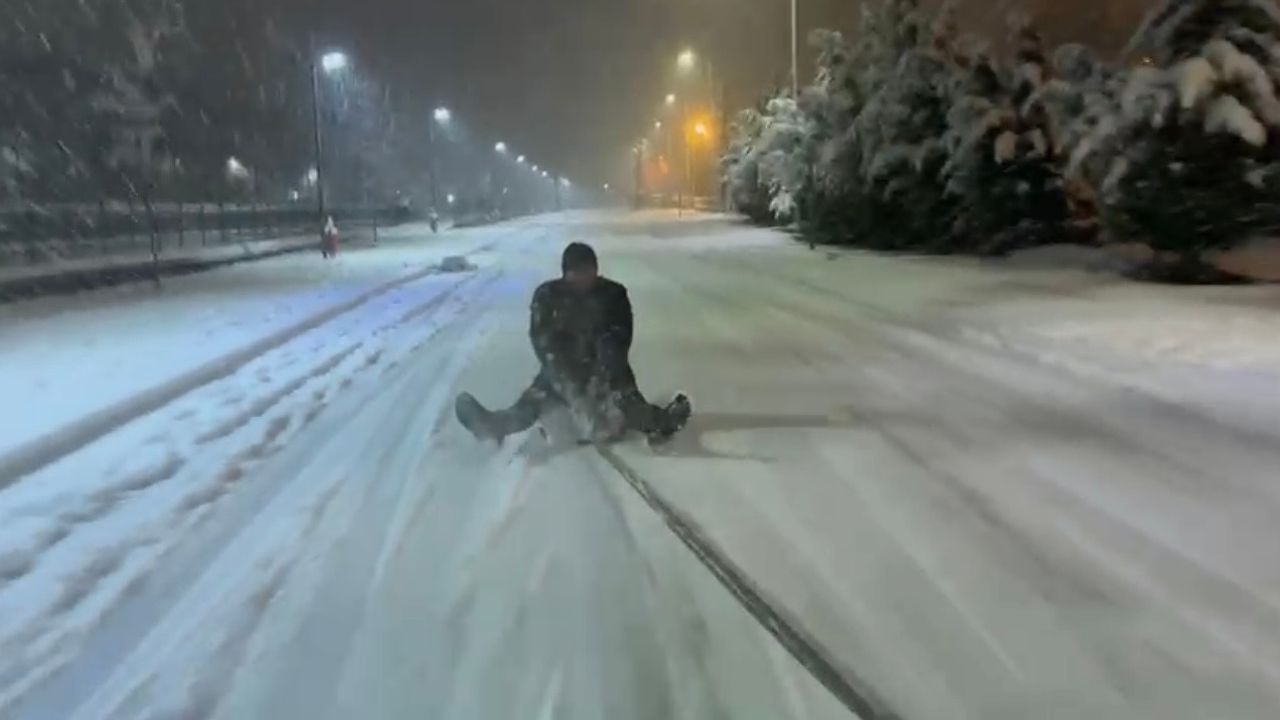 Ulus ilçesinde dün kar etkili oldu. İlçede kar kalınlığının yer yer 20 santimetreye ulaştı. Bir kişi, arkadaşına ait otomobilin arkasına iple bağladığı şambrele binerek, kaydı. O anlar cep telefonuyla görüntülendi. (DHA)