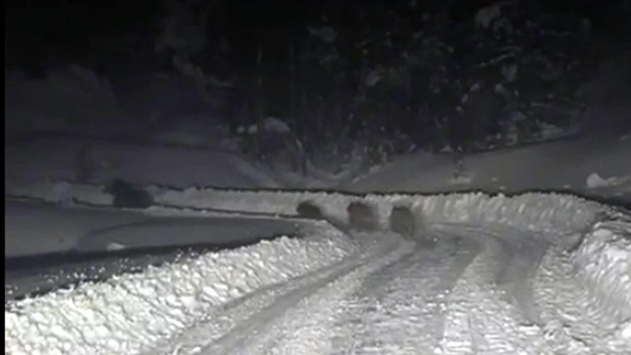 Ilgaz ilçesi Balcı köyünde, yoğun kar yağışı nedeniyle kapanan yolları açmak için çalışma yapan İl Özel İdaresi ekipleri, beklenmedik bir manzarayla karşılaştı. İş makineleriyle yolu açma ve kar temizleme çalışması yürüten ekiplerin önüne, ayı ve 3 yavrusu çıktı. Ekipleri fark eden ayıları, bölgeden uzaklaşıp ormana girerek gözden kayboldu. Çalışanlar o anları cep telefonu kamerasıyla kaydetti. (DHA)