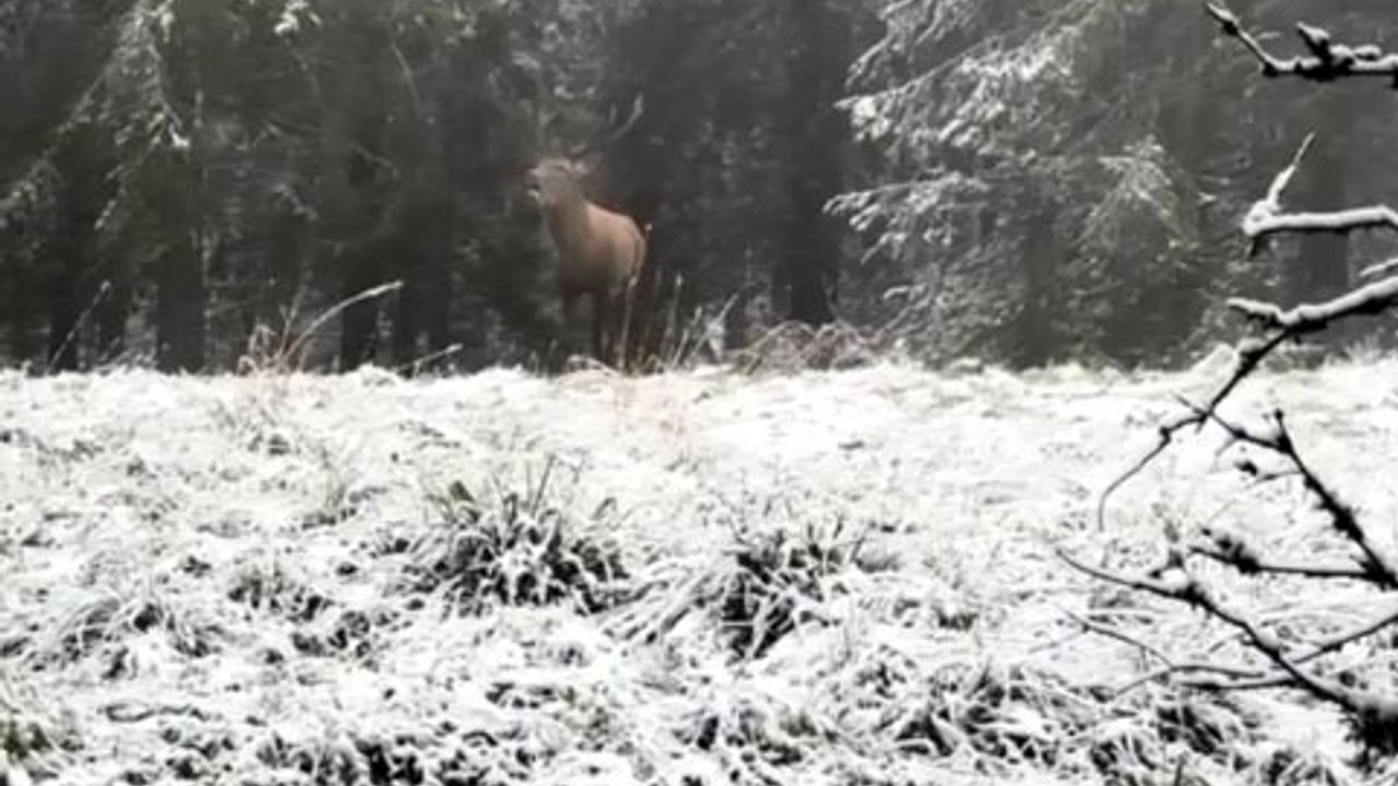 Yüzde 65'i ormanlarla kaplı Bolu'da doğa gezisine çıkan Sefa Eskioğlu, karlar içinde ilerleyen bir kızılgeyiği fark etti. Eskioğlu, o anları cep telefonuyla kaydetti. Karla kaplı ağaçların arasında dolaşan kızılgeyik, daha sonra gözden kayboldu. (DHA)