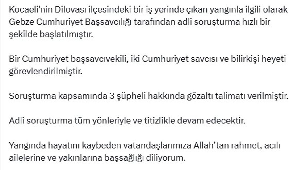 Adalet Bakanı Yılmaz Tunç, Kocaeli'nin Dilovası ilçesinde çıkan ve 6 kişinin hayatını kaybettiği yangınla ilgili paylaşımda bulundu. Bakan Tunç, sosyal medya hesabından yaptığı açıklamada, "Kocaeli'nin Dilovası ilçesindeki bir iş yerinde çıkan yangınla ilgili olarak Gebze Cumhuriyet Başsavcılığı tarafından adli soruşturma hızlı bir şekilde başlatılmıştır. Bir Cumhuriyet Başsavcıvekili, 2 Cumhuriyet savcısı ve bilirkişi heyeti görevlendirilmiştir. Soruşturma kapsamında 3 şüpheli hakkında gözaltı talimatı verilmiştir. Adli soruşturma tüm yönleriyle ve titizlikle devam edecektir. Yangında hayatını kaybeden vatandaşlarımıza Allah’tan rahmet, acılı ailelerine ve yakınlarına başsağlığı diliyorum. Yaralı vatandaşlarımızın en kısa sürede sağlıklarına kavuşmalarını temenni ediyorum" dedi. (DHA)