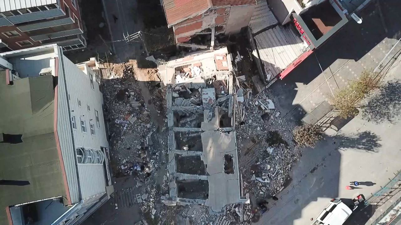 Kocaeli’nin Gebze ilçesinde yıkılan 7 katlı binanın yakınındaki tahliye edilen 16 bina dron ile görüntülendi. Ekipler ,bölgede inceleme ve çalışmalarını sürdürüyor. (DHA)