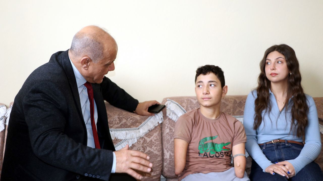 Behçet DALMAZ-Orhan AŞAN/VAN, (DHA)- VAN’ın Tuşba ilçesinde doğuştan dirsek altından kolları, diz altından da bacakları olmadığı için ilk ve ortaokulu evinde aldığı eğitimle tamamlayan Nakşin Özdemir (16), lise eğitimine de evinde devam ediyor. Sağlık raporu ve Rehberlik Araştırma Merkezi'nin raporu tanımlama işlemleri nedeniyle eğitim-öğretime gecikmeli başlayan Vali Haydar Bey Anadolu Lisesi 10'uncu sınıf öğrencisi Özdemir'i, Okul Müdürü İbrahim Seçkin, 3 öğretmeniyle birlikte evinde ziyaret ederek kitaplarını teslim etti. İlk dersini matematik öğretmeni Merve Nur Eken ile işleyen Özdemir, öğretmenlerine kavuştuğu için mutluluk duyduğunu, hedefinin bilgisayar mühendisliği olduğunu belirtti.