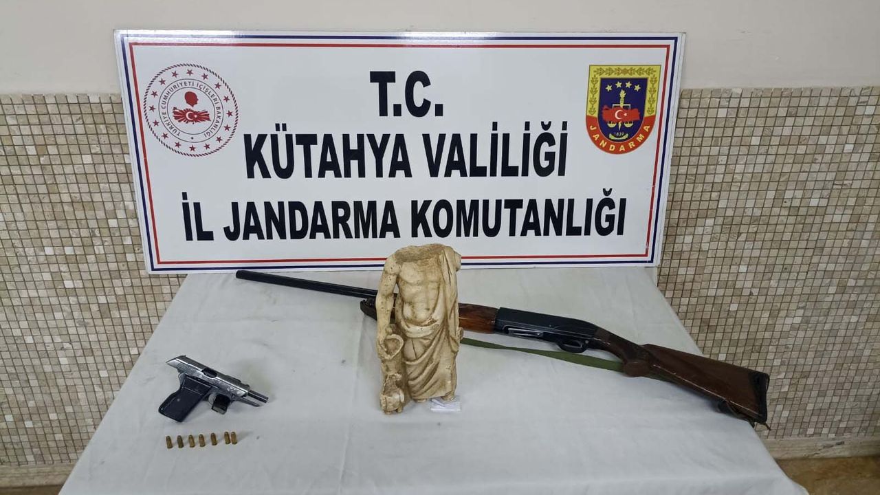Emet Jandarma Komutanlığı ekipleri, Kırgıl köyünde oturan C.B.’nin (31) evinde tarihi eser olduğu bilgisini aldı. Bir süre izlenen şüphelinin evine Cumhuriyet savcılığı talimatıyla baskın yapıldı. Evdeki aramalarda milattan önce 5’inci yüzyıla ait olduğu değerlendirilen Yunan mitolojisine göre tıp ve sağlık tanrısı Asklepios heykeli, ruhsatsız tabanca, 7 adet fişek ve tabancaya ait şarjör, yarı otomatik av tüfeği ele geçirildi. Şüpheli C.B.’nin ifadesi alınırken, hakkında adli soruşturma başlatıldı. (DHA)