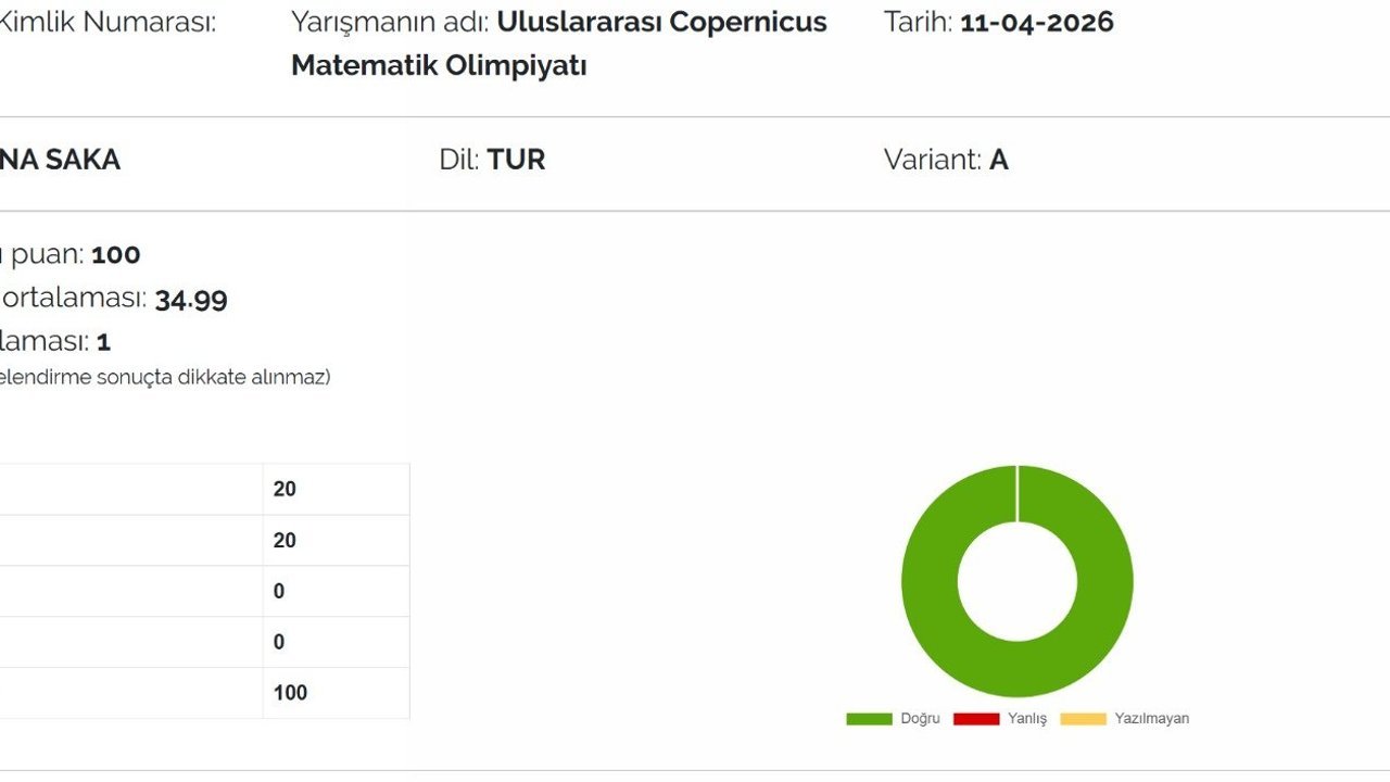 Selçuk BAŞAR-Efnan KÖSE/TRABZON, (DHA)- TRABZON'da yaşayan, katıldığı STEM Olimpiyatları'nda dünya birincisi olan 4'üncü sınıf öğrencisi Lina Saka (10), bu kez Uluslararası Copernicus Matematik Olimpiyatları'nda 100 tam puanla Türkiye birincisi olarak başarılarına bir yenisini daha ekledi. İtalya ve Singapur'un yanında Amerika'daki final yarışmalarında Türkiye'yi temsil etmeye hak kazanıp, uluslararası başarılarıyla dikkatleri çeken Saka, 'Bu yıl 23 Nisan Çocuk Bayramı'na üzgün girdik çünkü kaybettiğimiz arkadaşlarımız oldu. Bu başarıyı kendimce benimsemek yerine ülkemize ve özellikle okul saldırında kaybettiğimiz arkadaşlarıma hediye etmek istiyorum' dedi.