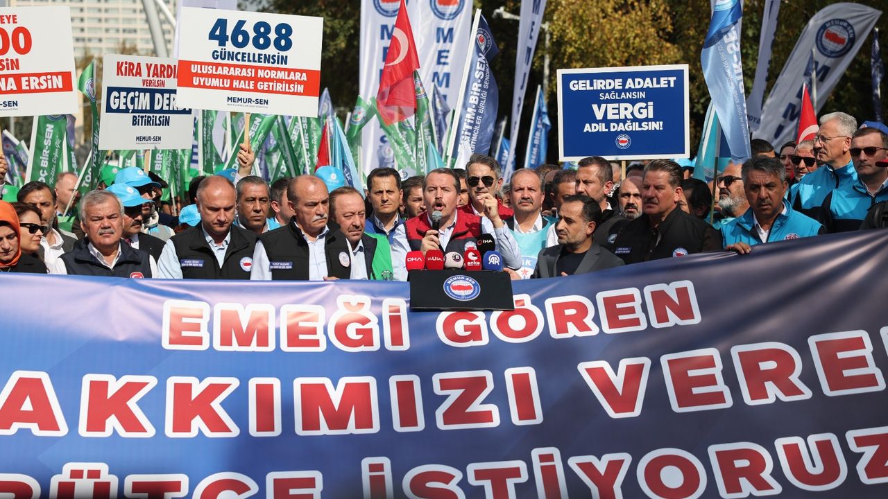 Memur-Sen üyeleri, bütçeye ilişkin taleplerini dile getirmek üzere TBMM Dikmen Kapısı önünde bir araya geldi. 'Emeği gören, hakkımızı veren bütçe istiyoruz', 'Gelirde adalet sağlansın, vergi adil alınsın', 'Gelir vergisinde oran sabitlensin, eşitsizlik bitsin', 'Kira yardımı yapılsın, geçim derdi bitirilsin' yazılı pankartlar taşıyan grup, sloganlar attı.