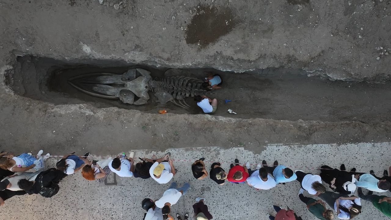 "Fin balinasının kazısı devam ediyor. 415 öğrencimizin katılımıyla birlikte başladığımız kazı bugün dördüncü gününde. Dördüncü gün itibarıyla kafa, boyun omurları ve göğüs bölgesinin tamamını toprak altından çıkarttık. Şimdi bel ve kuyruk omurları kısmı kaldı. İki gün içerisinde de tüm iskeleti müzemizin bahçesinde çıkartmayı planlıyoruz.” (DHA)