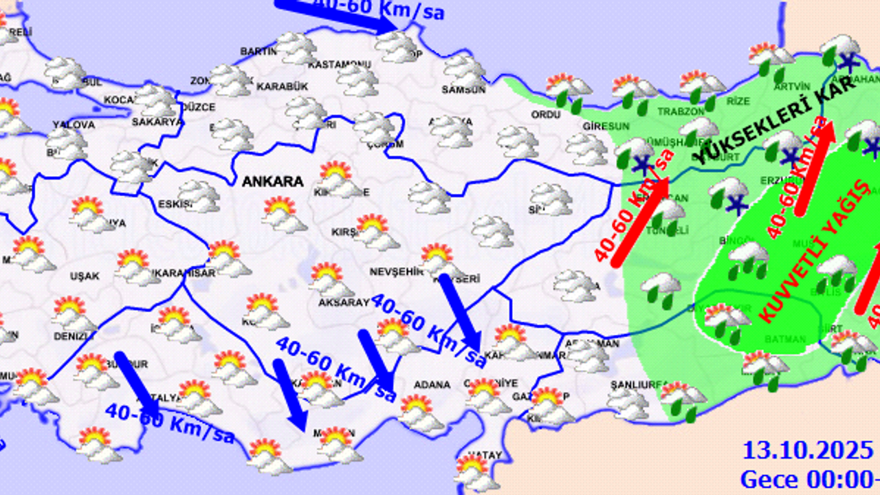Meteoroloji Genel Müdürlüğü tarafından yapılan tahminlere göre; bugün yurt geneli parçalı ve çok bulutlu, Marmara'nın doğusu, Doğu Akdeniz, İç Anadolu'nun güney ve doğusu, Karadeniz, Doğu ve Güneydoğu Anadolu yağışlı geçecek. Genellikle yağmur ve sağanak, İç Anadolu'nun kuzeydoğusunun yüksekleri, Doğu Karadeniz'in iç kesimlerinin yüksekleri ile Doğu Anadolu’nun kuzey ve doğusunun yüksek kesimlerinde karla karışık yağmur ve yer yer kar şeklinde görülecek. Yağışların; Batı Karadeniz kıyıları, Doğu Karadeniz, Doğu Anadolu, Güneydoğu Anadolu'nun doğusu ile Ordu, Tokat, Sivas, Kahramanmaraş, Osmaniye, Adana'nın doğusu ve Hatay kıyılarında yerel kuvvetli olması bekleniyor.