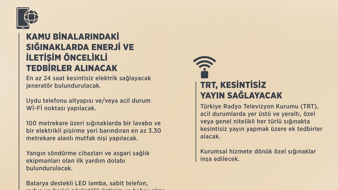 Resmi binalar ile sağlık ve eğitim yapılarındaki sığınaklarda, en az 24 saat kesintisiz elektrik teminini sağlayacak kapasitede jeneratör yapılması ve iletişim prizine ek olarak uydu telefonu altyapısı ve/veya acil durum Wİ-Fİ noktası yapılması gibi ilave tedbirler alınacak. 100 metrekare üzeri sığınaklarda bir lavabo ve bir elektrikli pişirme yeri barındıran en az 2,30 metrekare alanlı mutfak nişi yapılacak. Ayrıca sığınağın içinde yangın söndürme cihazları ve asgari sağlık ekipmanları bulunan bir ilkyardım dolabı bulundurulması şartı da getirildi. Sığınaklarda batarya destekli led lamba, sabit telefon, radyo ve harici görüntülü iletişim ve haber alma aygıtları bulundurulacak. Bu sayede iletişimin sürekliliğinin sağlanması öngörüldü.