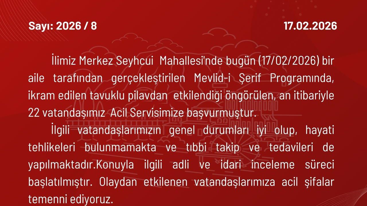 Amasya Valiliği tarafından yapılan açıklamada, 'İlimiz merkez Seyhcui Mahallesi'nde bugün (17/02/2026) bir aile tarafından gerçekleştirilen Mevlid-i Şerif programında, ikram edilen tavuklu pilavdan etkilendiği öngörülen, an itibariyle 22 vatandaşımız acil servisimize başvurmuştur. İlgili vatandaşlarımızın genel durumları iyi olup, hayati tehlikeleri bulunmamakta ve tıbbi takip ve tedavileri de yapılmaktadır. Konuyla ilgili adli ve idari inceleme süreci başlatılmıştır. Olaydan etkilenen vatandaşlarımıza acil şifalar temenni ediyoruz' denildi.