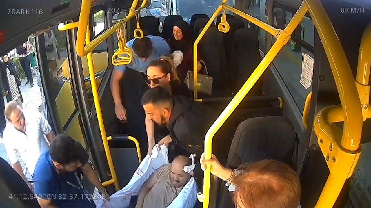 Olay, perşembe günü saat 15.00 sıralarında Yenişehir Mahallesi'nde meydana geldi. Öğlebeli-Şirinevler Mahallesi güzargahında çalışan minibüs sürücüsü Uğur Dereli'nin kullandığı minibüste bir yolcu fenalaştı. Yolcular, durumu fark ederek Uğur Dereli'ye bilgi verdi. Dereli, güzergah değiştirerek Karabük Eğitim ve Araştırma Hastanesi'ne hareket etti. O anlar, aracın güvenlik kamerasına yansıdı. Rahatsızlanan kişi, yolcuların ve sağlık görevlilerinin yardımıyla hastaneye taşındı. Yolcunun hastanedeki tedavisinin devam ettiği öğrenildi. (DHA)