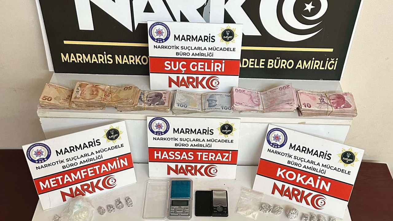 İl Emniyet Müdürlüğü Narkotik Suçlarla Mücadele Şube Müdürlüğü ekipleri, Marmaris’te uyuşturucu madde ticareti yaptığı öne sürülen 3 şüphelinin kaldığı otele operasyon düzenledi. Şüphelilerin otel odası ve otomobilinde yapılan aramada 13 gram metamfetamin, 14 gram kokain, 3,4 gram esrar, 72 sentetik ecza hapı, 2 hassas terazi, suçtan elde edildiği değerlendirilen para ele geçirildi. Gözaltına alınan 3 şüpheli, emniyette işlemlerinin ardından adliyeye sevk edildi. Hakim karşısına çıkan 3 şüpheli, tutuklandı. (DHA)