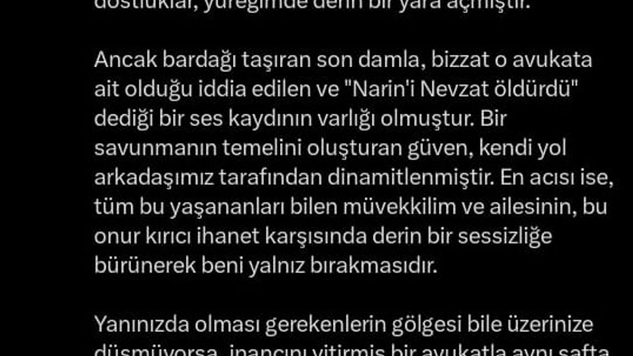 “Ancak bardağı taşıran son damla, bizzat o avukata ait olduğu iddia edilen ve ‘Narin'i Nevzat öldürdü’ dediği bir ses kaydının varlığı olmuştur. Bir savunmanın temelini oluşturan güven, kendi yol arkadaşımız tarafından dinamitlenmiştir. En acısı ise tüm bu yaşananları bilen müvekkilim ve ailesinin, bu onur kırıcı ihanet karşısında derin bir sessizliğe bürünerek beni yalnız bırakmasıdır. Yanınızda olması gerekenlerin gölgesi bile üzerinize düşmüyorsa, inancını yitirmiş bir avukatla aynı safta durmanız isteniyorsa ve en önemlisi, savunduğunuz kişinin masumiyetine dair şüphe bizzat ortağınız tarafından dile getiriliyorsa, o savaşta daha fazla kalınamaz. Ama Narin Davası'nda, Narin için yapmış olduğum ve yapacağım çalışmalarla elde ettiğim bilgiler doğrultusunda bir vatandaş olarak dışarıda kalan, yargılamalara dahil olmayan ya da başka suçlardan yargılanan suça karışan kişilerin de yargılanması için Diyarbakır Cumhuriyet Başsavcılığı'na ihbarlarda bulunmaya ve rahatsız etmeye devam edeceğim. Bu, bir pes ediş değil, hakikate ve meslek ve şahsi onuruma olan saygımın bir gereğidir. Saygılarımla.” (DHA)