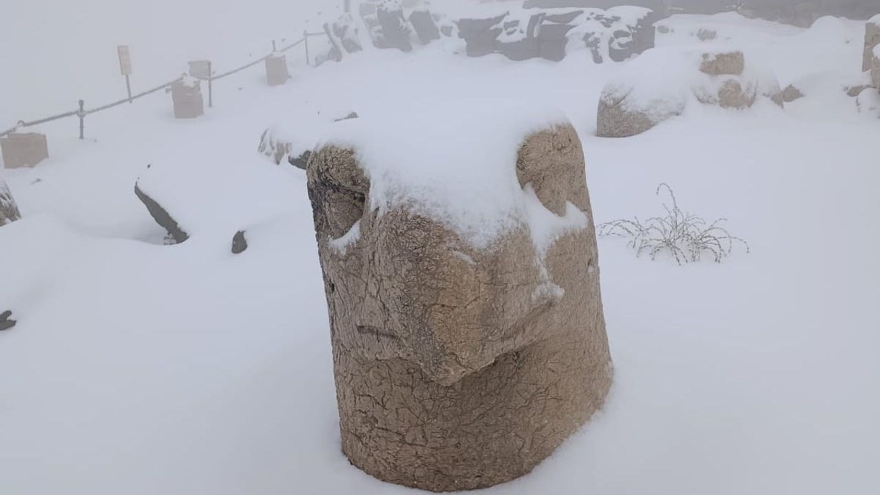 Mahir ALAN/ADIYAMAN, (DHA)- ADIYAMAN’ın Kahta ilçesindeki UNESCO Dünya Mirası Listesi’ndeki Nemrut Dağı, etkili olan kar yağışıyla beyaza büründü. Karla kaplanan zirvedeki heykeller, ziyaretçilere eşsiz manzara sundu.