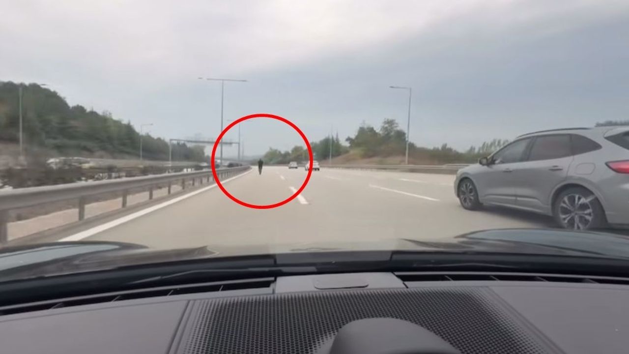 Yiğithan HÜYÜK/BURSA, (DHA)-BURSA'da otoyolun sol şeridinden yürüyen yaya, kendisini fark eden otomobil sürücüsünün manevrası sayesinde kurtuldu. O anlar, araç kamerasına yansıdı.