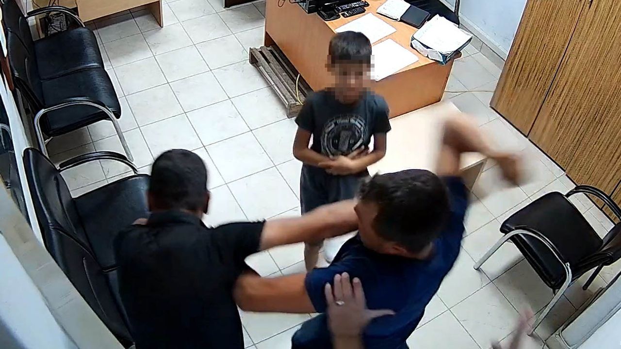 MERSİN, (DHA)- MERSİN'de, Mehmet T.'nin (48) polis merkezinde çocuğunun gözü önünde kayınbiraderi K.D. tarafından darbedildiği anlar, güvenlik kamerasına yansıdı.