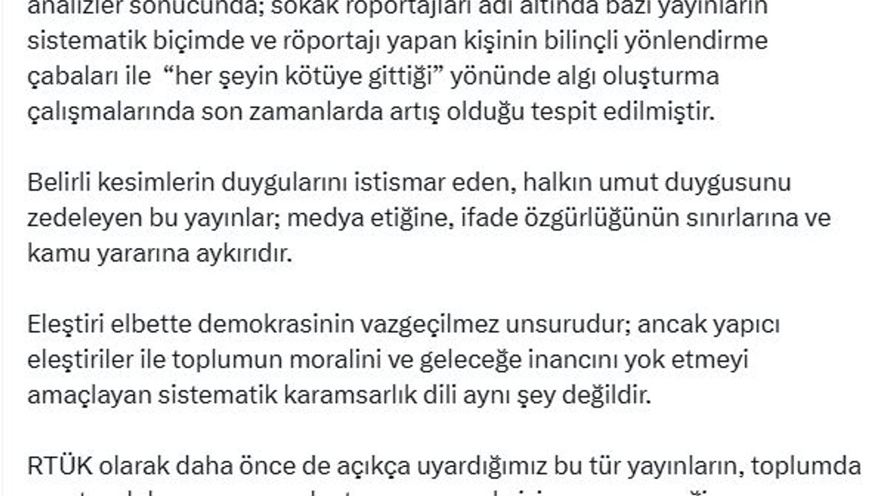 RTÜK Başkanı Ebubekir Şahin, sosyal medya hesabından yaptığı açıklamada, "Üst Kurulumuzun izleme ve değerlendirme uzmanları tarafından yapılan analizler sonucunda; 'sokak röportajları' adı altında bazı yayınların sistematik biçimde ve röportajı yapan kişinin bilinçli yönlendirme çabaları ile her şeyin kötüye gittiği yönünde algı oluşturma çalışmalarında son zamanlarda artış olduğu tespit edilmiştir. Belirli kesimlerin duygularını istismar eden, halkın umut duygusunu zedeleyen bu yayınlar; medya etiğine, ifade özgürlüğünün sınırlarına ve kamu yararına aykırıdır. Eleştiri elbette demokrasinin vazgeçilmez unsurudur; ancak yapıcı eleştiriler ile toplumun moralini ve geleceğe inancını yok etmeyi amaçlayan sistematik karamsarlık dili aynı şey değildir. RTÜK olarak daha önce de açıkça uyardığımız bu tür yayınların, toplumda umutsuzluk ve ayrışma oluşturmasına asla izin vermeyeceğiz. Kamuoyunu kasıtlı biçimde yönlendiren, halkı karamsarlığa sürükleyen içeriklere müsamaha gösterilmeyeceğini bir kez daha vurguluyor, benzeri yayınlarla ilgili tüm yasal yetkileri sonuna kadar kullanacağımızı önemle hatırlatıyoruz" ifadelerini kullandı. (DHA)