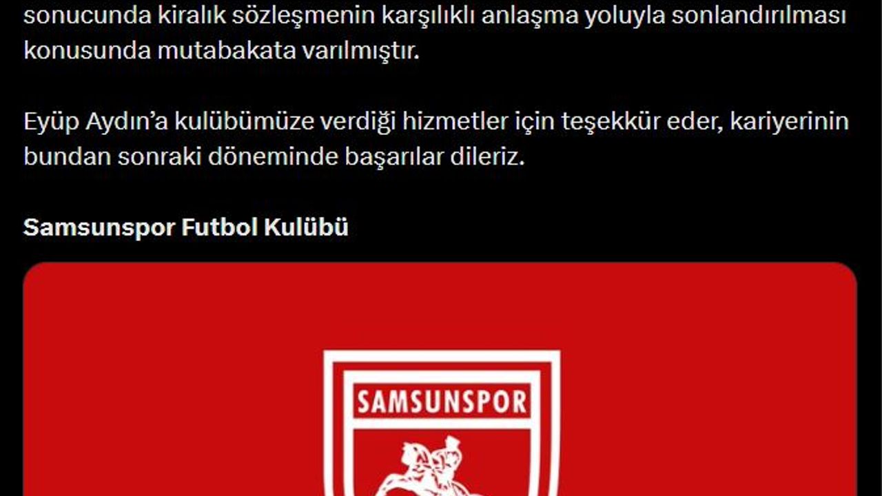 Berkay YILDIZ/SAMSUN, (DHA)- SAMSUNSPOR, sezon başında Galatasaray'dan kiralık olarak kadrosuna kattığı profesyonel futbolcu Eyüp Aydın'ın sözleşmesinin karşılıklı anlaşmayla sona erdirildiğini açıkladı.