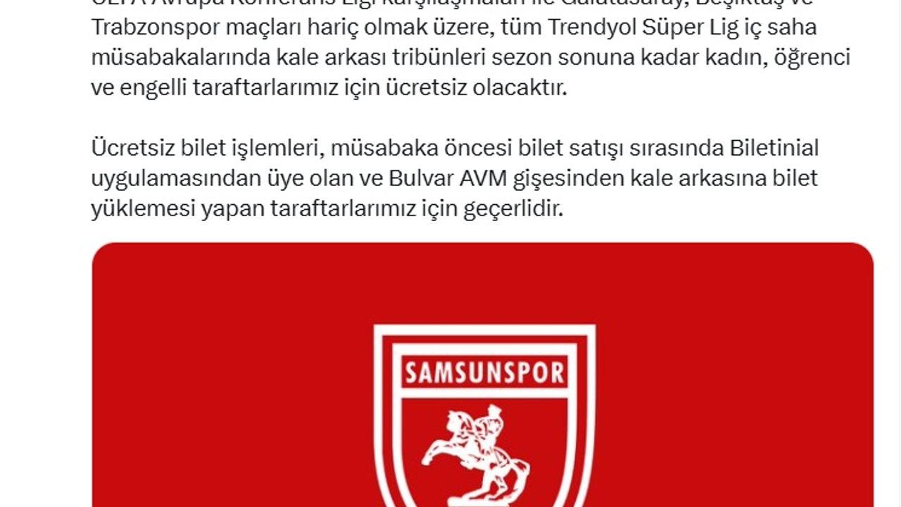 Öte yandan kırmızı-beyazlılarda UEFA Konferans Ligi karşılaşmaları, Galatasaray, Beşiktaş ve Trabzonspor maçları haricinde tüm iç saha karşılaşmalarında kale arkası tribünlerin sezon sonuna kadar kadın, öğrenci ve engelli taraftarlara ücretsiz olduğu açıklandı. Yapılan açıklamada, “Kulübümüz tarafından alınan karar doğrultusunda, UEFA Avrupa Konferans Ligi karşılaşmaları ile Galatasaray, Beşiktaş ve Trabzonspor maçları hariç olmak üzere, tüm Süper Lig iç saha müsabakalarında kale arkası tribünleri sezon sonuna kadar kadın, öğrenci ve engelli taraftarlarımız için ücretsiz olacaktır. Ücretsiz bilet işlemleri, müsabaka öncesi bilet satışı sırasında ‘Biletinial’ uygulamasından üye olan ve Bulvar AVM girişişinden kale arkasına bilet yüklemesi yapan taraftarlarımız için geçerlidir” denildi.