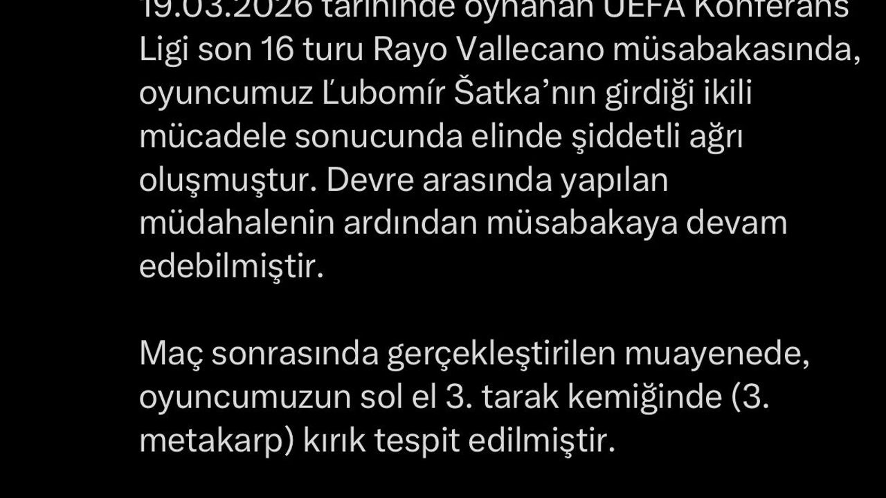 Berkay YILDIZ / SAMSUN, (DHA)- SAMSUNSPOR'UN, 19 Mart 2026 tarihinde UEFA Konferans Ligi Son 16 Turu'nda deplasmanda İspanya temsilcisi Rayo Vallecano ile oynadığı karşılaşmada sakatlanan Slovak oyuncu Lubomir Satka'nın sol elinde kırık tespit edildi.