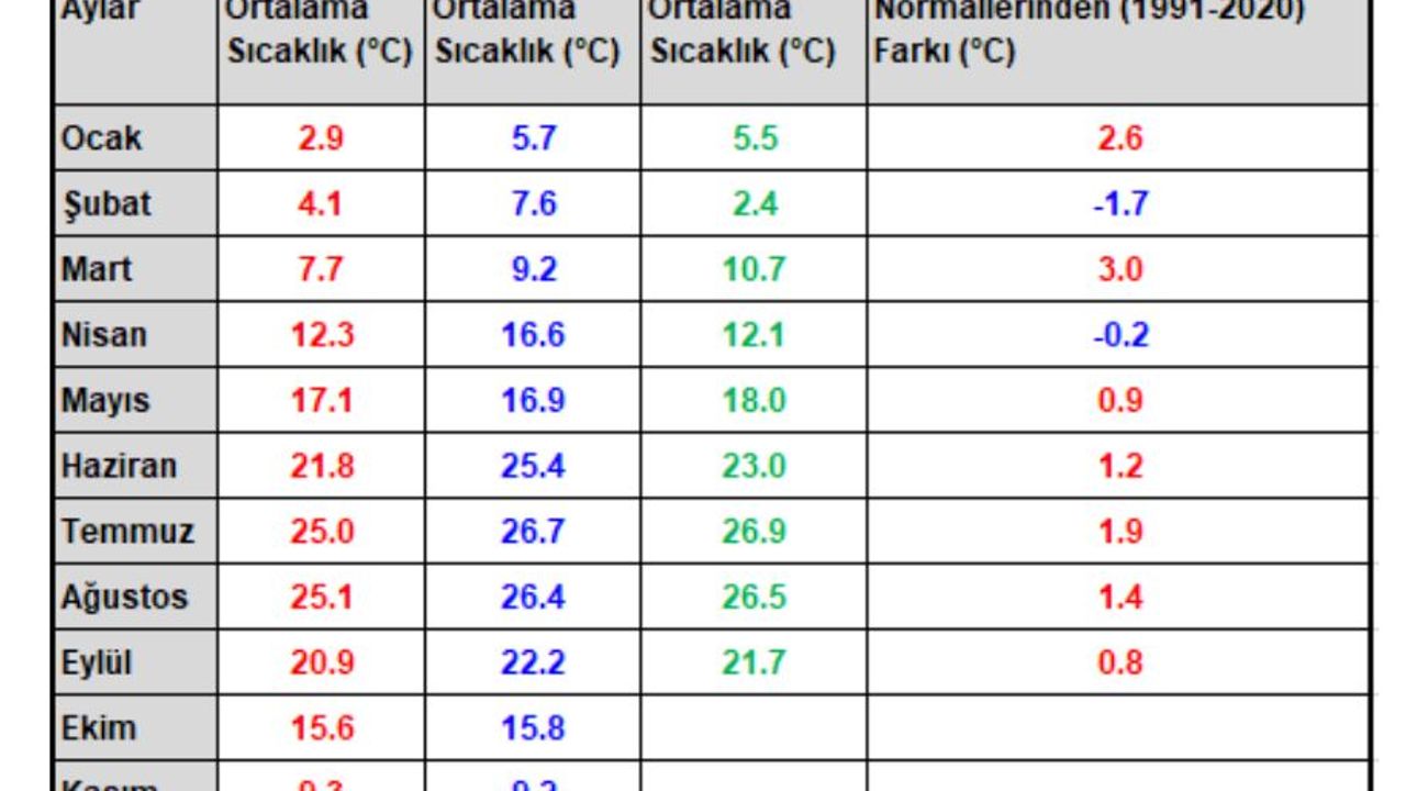 Öte yandan, Türkiye'de iklim değerlendirilmesinde kullanılan 220 istasyonda eylül ayında sıcaklık değerleri ölçüldü. Buna göre, Akdeniz Bölgesi’nin geneli, Edirne, Kadıköy, Kocaeli, Gökçeada, Çanakkale, Bursa, Yalova, Ayvalık, Dikili, Manisa, Uşak, İzmir, Çeşme, Kuşadası, Aydın, Denizli, Bodrum, Muğla, Marmaris, Uzunköprü, İpsala, Burhaniye, Bergama, Gediz, Seferihisar, Ödemiş, Nazilli ve Yatağan çevrelerinde sıcaklık mevsim normallerinin üzerinde, yurdun diğer kesimlerinde ise mevsim normalleri civarında gerçekleşti. 2025 yılı Eylül ayında ekstrem sıcaklıklar, sıfırın altında 2,4 derece ile Erzurum'da, en yüksek sıcaklık ise 44,6 derece ile Cizre'de ölçüldü. (DHA)
