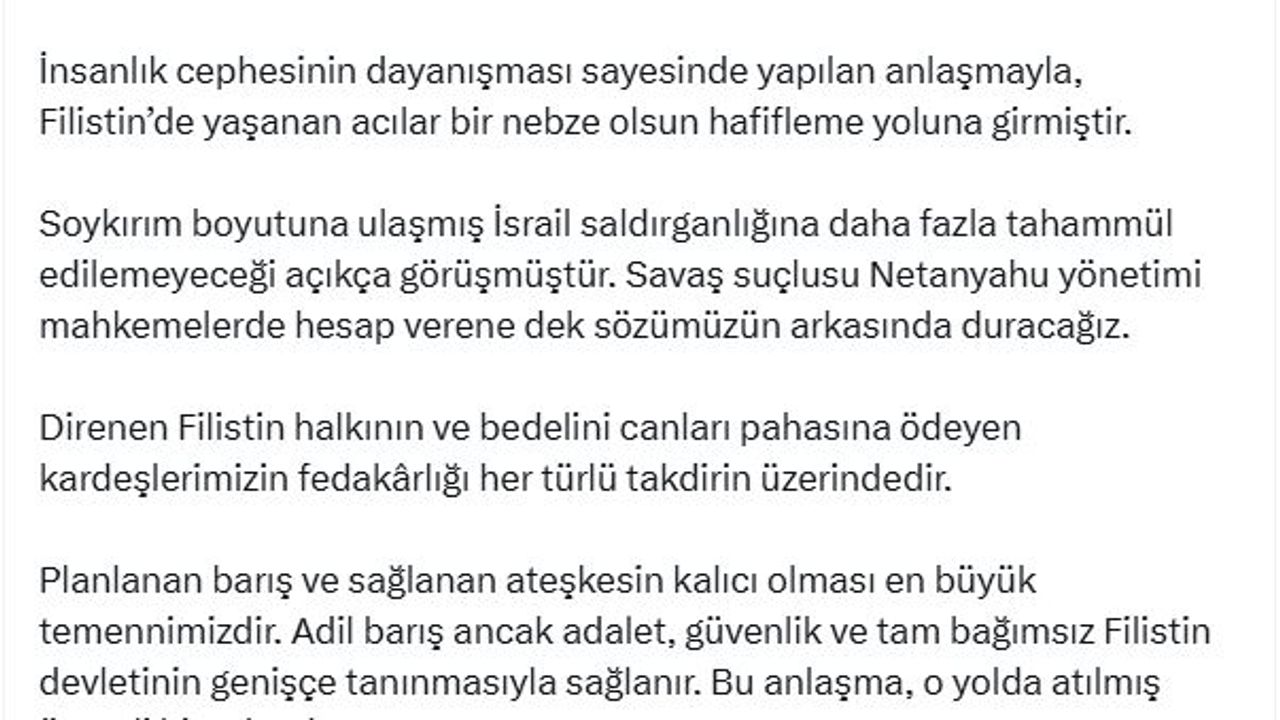 ANKARA, (DHA)- TBMM Başkanı Numan Kurtulmuş, "Planlanan barış ve sağlanan ateşkesin kalıcı olması en büyük temennimizdir. Adil barış ancak adalet, güvenlik ve tam bağımsız Filistin devletinin genişçe tanınmasıyla sağlanır. Bu anlaşma, o yolda atılmış önemli bir adımdır" dedi.