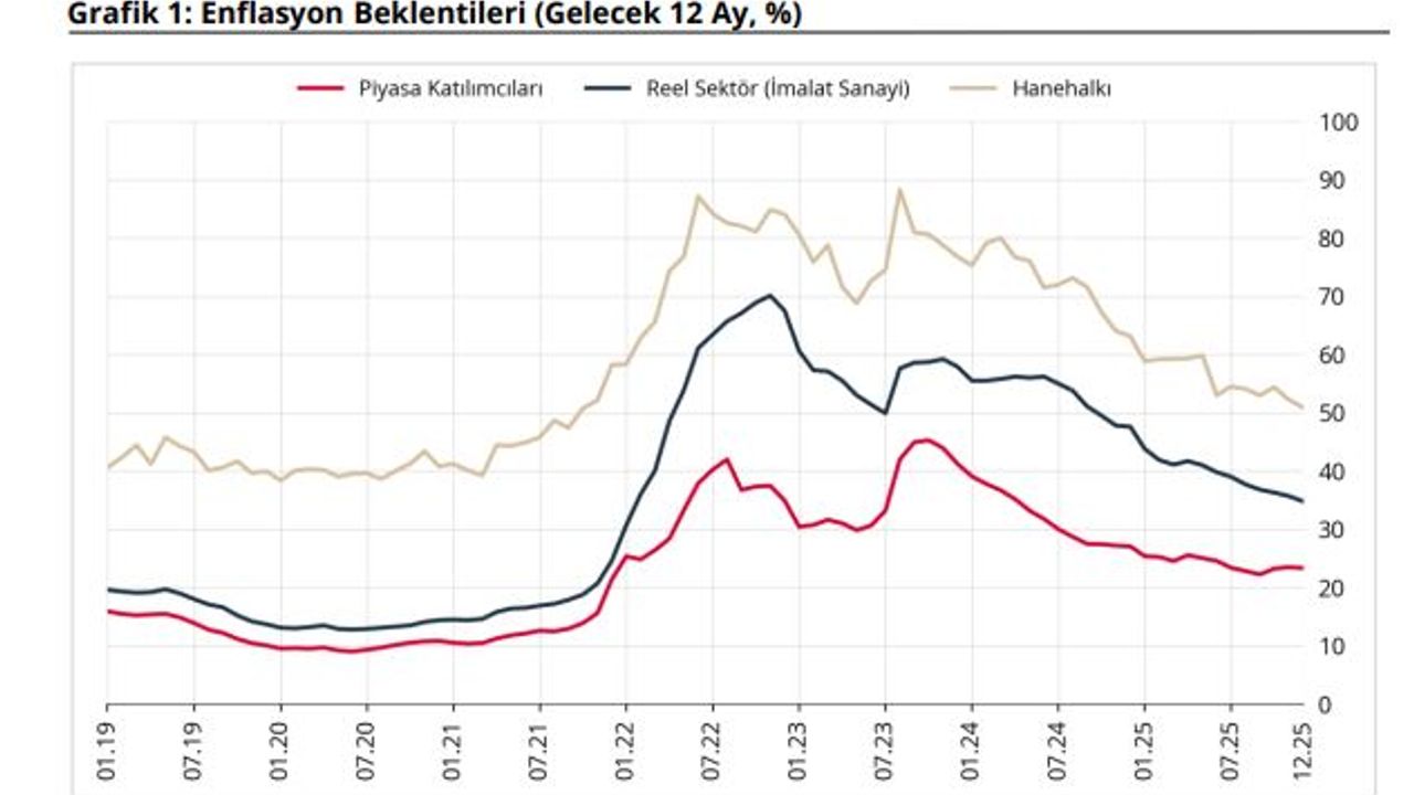ANKARA, (DHA)-TÜRKİYE Cumhuriyet Merkez Bankası (TCMB), aralık ayında 12 ay sonrası enflasyon beklentilerinin bir önceki aya göre piyasa katılımcıları, reel sektör ve hanehalkı için azaldığını açıkladı.