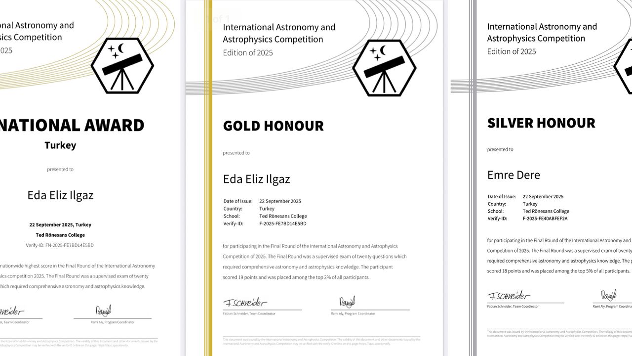 İSTANBUL, (DHA)- TED Rönesans Koleji lise öğrencisi Eda Eliz Ilgaz, 2025 Uluslararası Astronomi ve Astrofizik Yarışması’nın (The International Astronomy and Astrophysics Competition-IAAC) final etabını ‘Türkiye Şampiyonu’ olarak tamamladı.
