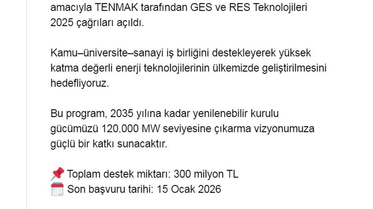 Enerji ve Tabii Kaynaklar Bakanı Alparslan Bayraktar, proje çağrılarıyla ilgili NSosyal hesabından yaptığı açıklamada, "Rüzgar ve güneş teknolojilerinde yerli üretimi güçlendirmek ve yenilenebilir enerjide küresel rekabet gücümüzü artırmak amacıyla TENMAK tarafından GES ve RES Teknolojileri 2025 çağrıları açıldı. Kamu-üniversite-sanayi iş birliğini destekleyerek yüksek katma değerli enerji teknolojilerinin ülkemizde geliştirilmesini hedefliyoruz. Bu program, 2035 yılına kadar yenilenebilir kurulu gücümüzü 120 bin MW seviyesine çıkarma vizyonumuza güçlü bir katkı sunacaktır" dedi. (DHA)
