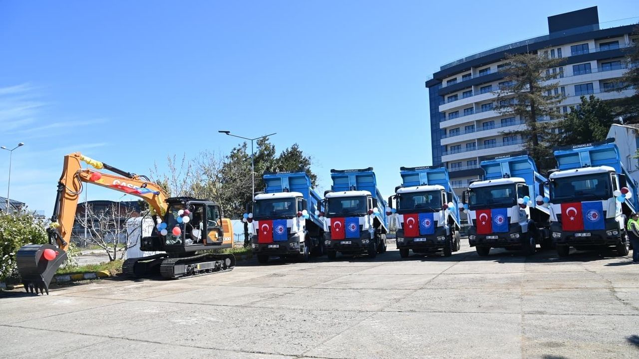TRABZON, (DHA)-TRABZON Büyükşehir Belediyesi, hizmet kapasitesini artırmak amacıyla araç filosuna 5 yeni kamyon ve 1 iş makinesi daha kazandırdı. Yeni araçların hizmete alım töreninde konuşan Büyükşehir Belediye Başkanı Ahmet Metin Genç, 'Sıfır kamyon ve iş makinesi alımlarında yüzde 50 oranında artış sağlayarak filomuzun gençleşmesine katkı sunduk' dedi.