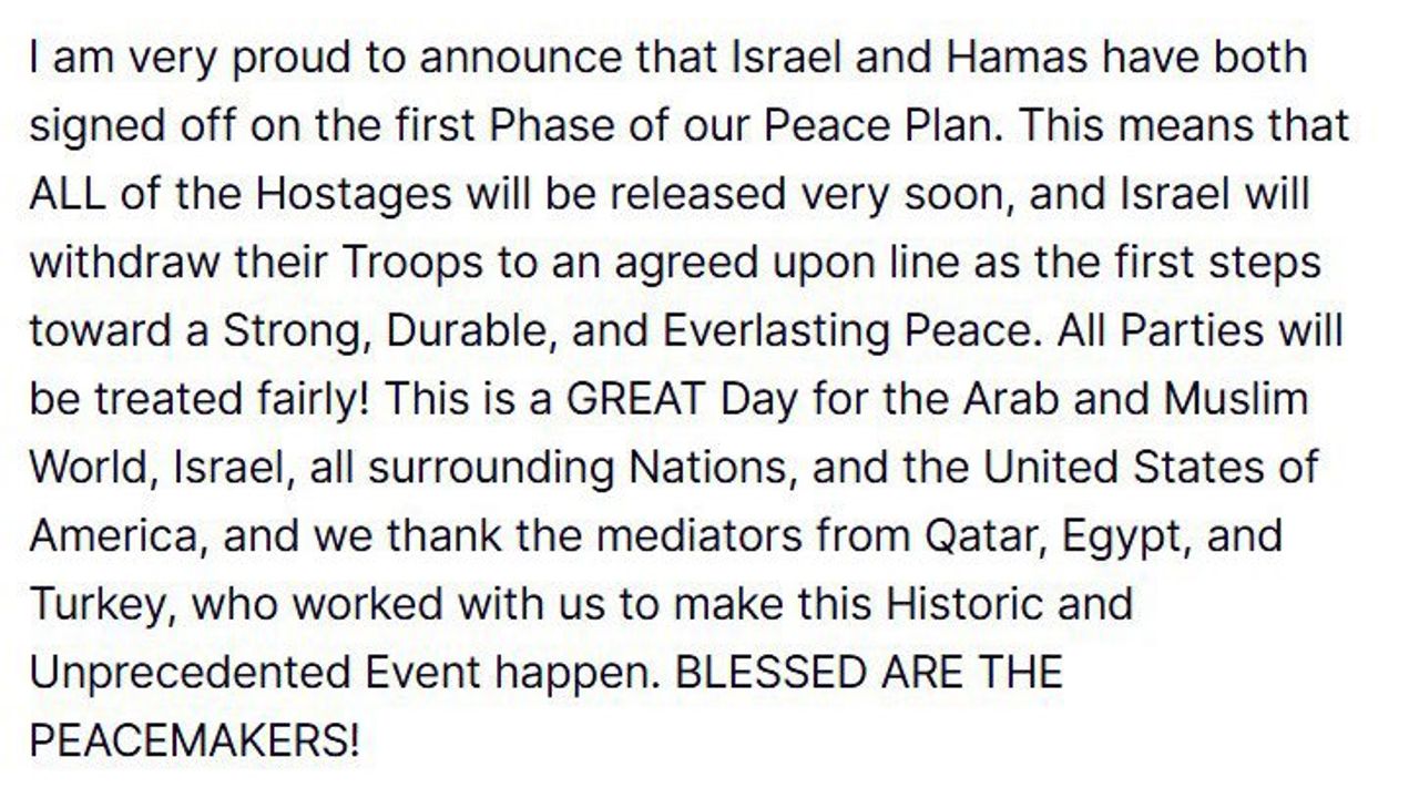 ABD, (DHA)- ABD Başkanı Donald Trump, İsrail ve Hamas'ın barış planının ilk aşamasını onayladığını açıkladı.