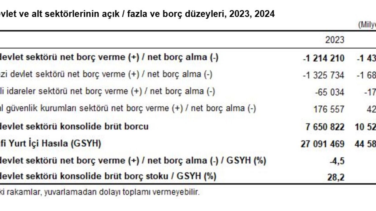 TÜİK, 2024 yılına ilişkin 'Devlet Hesapları' bültenini yayımladı. Buna göre, genel devlet açığı 2024 yılında 1 trilyon 438 milyar 854 milyon TL olarak tahmin edildi ve bir önceki yıl yüzde 4,5 olan genel devlet açığının GSYH'ye oranı yüzde 3,2'ye düştü. Merkezi devlet ve mahalli idareler alt sektörleri 2024 yılında açık verirken, sosyal güvenlik kurumları alt sektörü fazla verdi. Genel devlet konsolide brüt borç stokunun GSYH'ye oranı ise 2024 yılında yüzde 23,6'ya düştü.