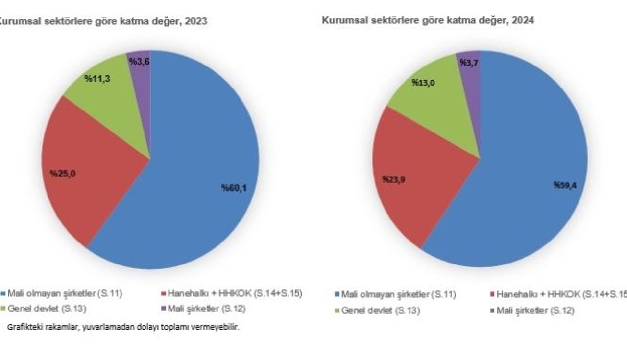 TÜİK, 2024 yılına ilişkin 'Kurumsal Sektör Hesapları' bültenini yayımladı. Buna göre, gayrisafi milli hasıla 2024 yılında bir önceki yıla göre yüzde 64,3 artarak 44 trilyon 44 milyar 657 milyon 144 bin TL oldu. Mali olmayan şirketler, toplam ekonomide yaratılan katma değere en fazla katkıyı yapan sektör oldu. Mali olmayan şirketlerin toplam katma değer içindeki payı 2024 yılında yüzde 59,4 olarak gerçekleşti. Bu sektörü sırasıyla hanehalkı ve hanehalkına hizmet veren kar amacı olmayan kuruluşlar (HHKOK) ile genel devlet takip etti.