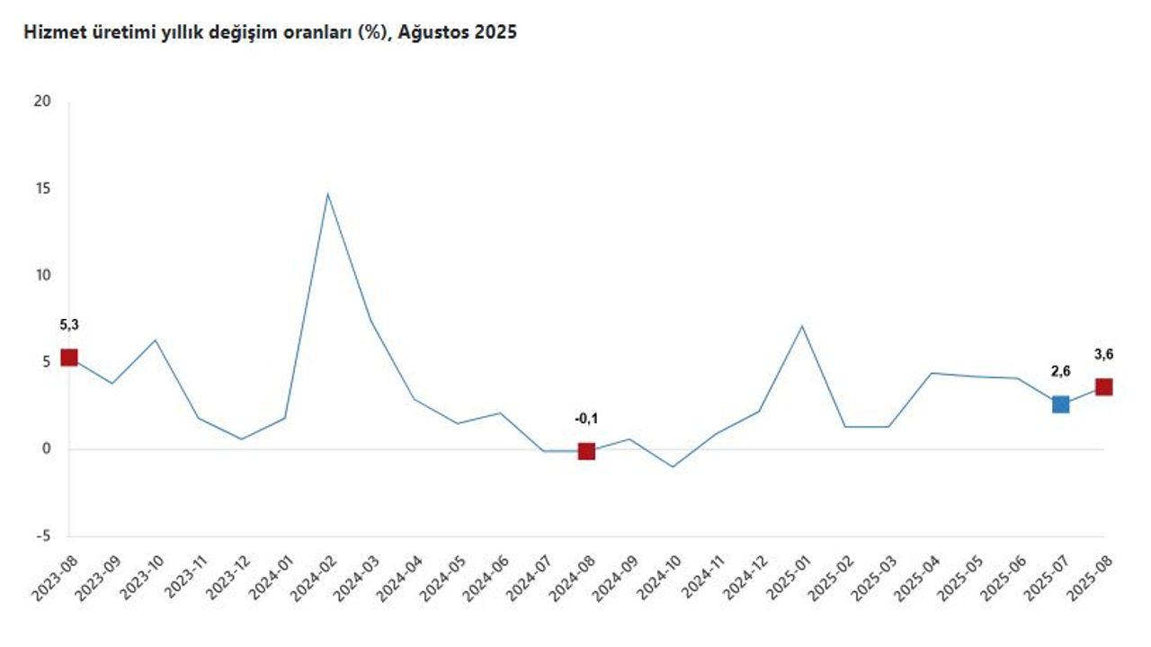 ANKARA, (DHA)- TÜRKİYE İstatistik Kurumu (TÜİK), ağustos ayında hizmet üretiminin yıllık yüzde 3,6; aylık yüzde 0,4 arttığını açıkladı.