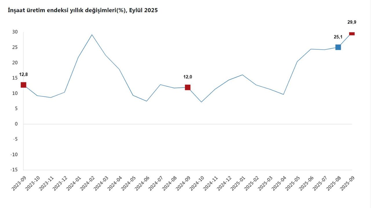 TÜİK, Eylül 2025 inşaat üretim endeksi verilerini açıkladı. Buna göre; inşaat üretimi, bir önceki yılın aynı ayına göre yüzde 29,9 arttı. İnşaatın alt sektörleri incelendiğinde, 2025 yılı Eylül ayında bina inşaatı sektörü endeksi bir önceki yılın aynı ayına göre yüzde 31,2 arttı, bina dışı yapıların inşaatı sektörü endeksi yüzde 23,3 arttı ve özel inşaat faaliyetleri sektörü endeksi yüzde 30,1 arttı.