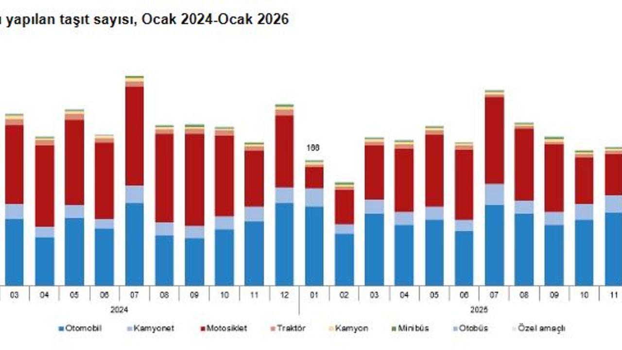 TÜİK, Ocak 2026 dönemine ilişkin motorlu kara taşıtları istatistiklerini açıkladı. Buna göre; ocak ayında 144 bin 620 adet taşıtın trafiğe kaydı yapıldı. Ocak ayında trafiğe kaydı yapılan taşıtların yüzde 56,1'ini otomobil, yüzde 18,7'sini motosiklet, yüzde 18,4'ünü kamyonet, yüzde 3,3'ünü kamyon, yüzde 1,3'ünü minibüs, yüzde 1,3'ünü traktör, yüzde 0,6'sını otobüs ve yüzde 0,3'ünü özel amaçlı taşıtlar oluşturdu. Trafiğe kaydı yapılan taşıt sayısı, bir önceki aya göre yüzde 41,7 azaldı. Ocak ayında trafiğe kaydı yapılan taşıt sayısı bir önceki aya göre kamyonda yüzde 59, otobüste yüzde 36,4, minibüste yüzde 34 artarken traktörde yüzde 62,6, motosiklette yüzde 53,7, otomobilde yüzde 44,9, kamyonette yüzde 17 ve özel amaçlı taşıtta yüzde 12,2 azaldı. Trafiğe kaydı yapılan taşıt sayısı geçen yılın aynı ayına göre de yüzde 12,7 azaldı. Ocak ayında geçen yılın aynı ayına göre trafiğe kaydı yapılan taşıt sayısı özel amaçlı taşıtta yüzde 186,3, otobüste yüzde 38,2, kamyonda yüzde 24,5, kamyonette yüzde 9,5, minibüste yüzde 9,1 artarken traktörde yüzde 41, otomobilde yüzde 22,3 ve motosiklette yüzde 2 azaldı.