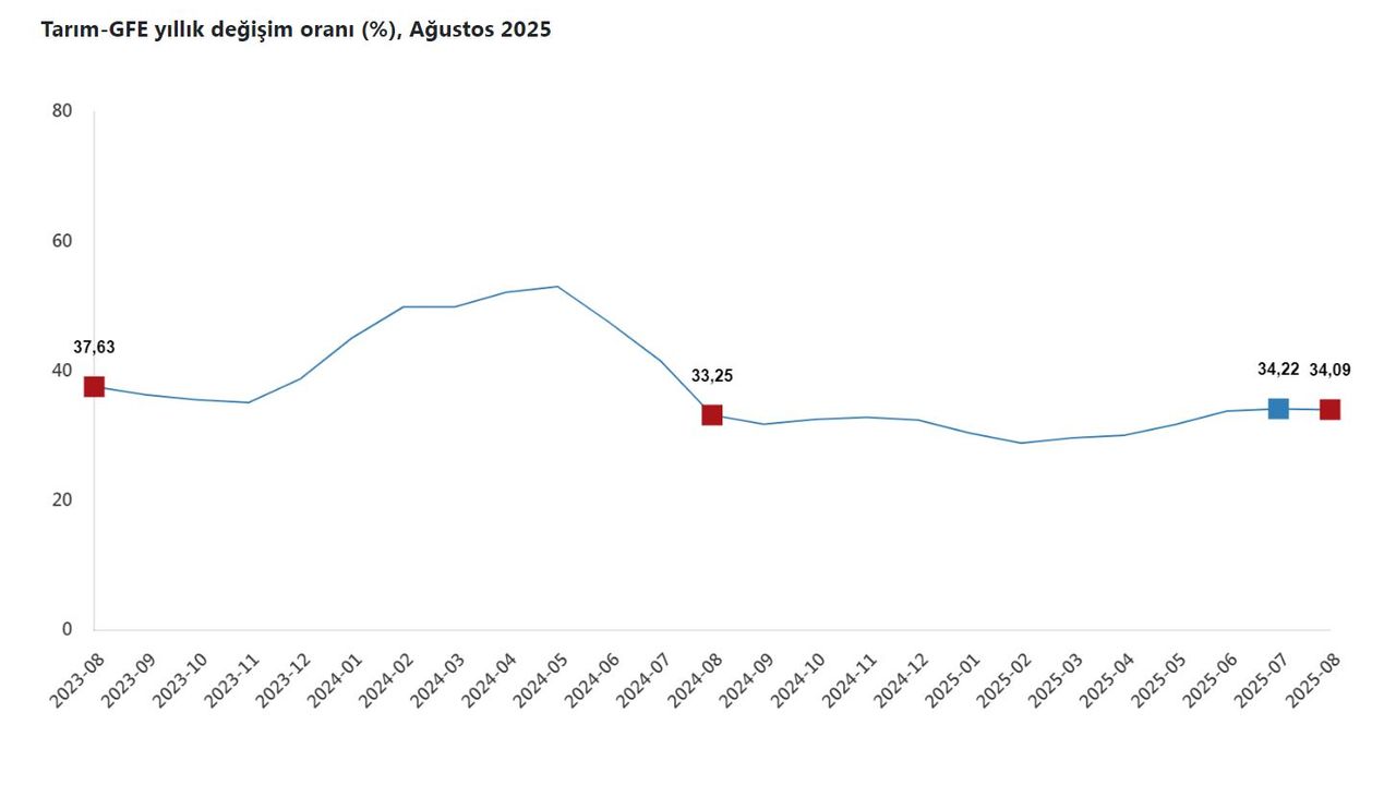TÜİK, Ağustos 2025 dönemine ilişkin tarımsal girdi fiyat endeksi verilerini açıkladı. Buna göre; tarımsal girdi fiyatları, ağustos ayında bir önceki aya göre yüzde 1,30, bir önceki yılın aralık ayına göre yüzde 23,81, bir önceki yılın aynı ayına göre yüzde 34,09 ve 12 aylık ortalamalara göre yüzde 31,94 arttı. Ana gruplarda ise bir önceki aya göre, tarımda kullanılan mal ve hizmetler endeksinde yüzde 1,55 artış, tarımsal yatırıma katkı sağlayan mal ve hizmetler endeksinde yüzde 0,18 azalış gerçekleşti. Bir önceki yılın aynı ayına göre tarımda kullanılan mal ve hizmetler endeksinde yüzde 35,07 artış, tarımsal yatırıma katkı sağlayan mal ve hizmetler endeksinde yüzde 28,51 artış gerçekleşti. Yıllık değişimin en yüksek olduğu alt grup yüzde 59,79 artış ile veteriner harcamaları, aylık değişimin en yüksek olduğu alt grup yüzde 3,94 artış ile gübre ve toprak geliştiriciler oldu. (DHA)