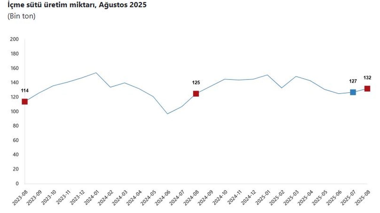 Bir önceki ay 946 bin 158 ton olan ticari süt işletmeleri tarafından toplanan inek sütü miktarı ağustos ayında yüzde 1,4 oranında azalarak 933 bin 234 ton oldu. Bir önceki ay 127 bin 164 ton olan içme sütü üretimi ağustos ayında yüzde 4,1 oranında artarak 132 bin 359 ton olarak gerçekleşti.