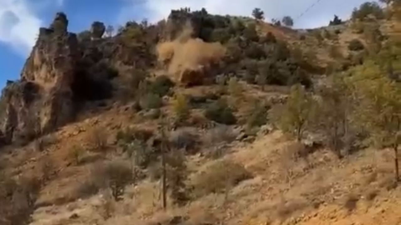 Serhat Ozan YILDIRIM/ TUNCELİ, (DHA)- TUNCELİ- Ovacık karayolunda, kaya düşmelerini engellemek için çalışma başlatıldı. Çalışmalar sırasında kayaların dağdan kopma anı cep telefonu kamerasıyla kaydedildi.