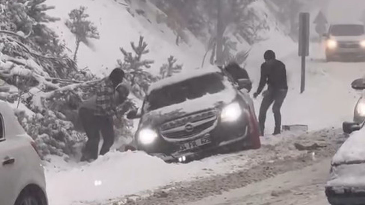 Uludağ yolunda metrelerce araç kuyruğunda beklemekten sıkılan bazı yolcular, araçlardan inip, kar altında trafiğin açılmasını beklerken kayan bazı araçlar ise kaza yaptı. Uludağ yolunda karlar altındaki dönüş çilesi cep telefonu kamerasıyla görüntülendi. (DHA)