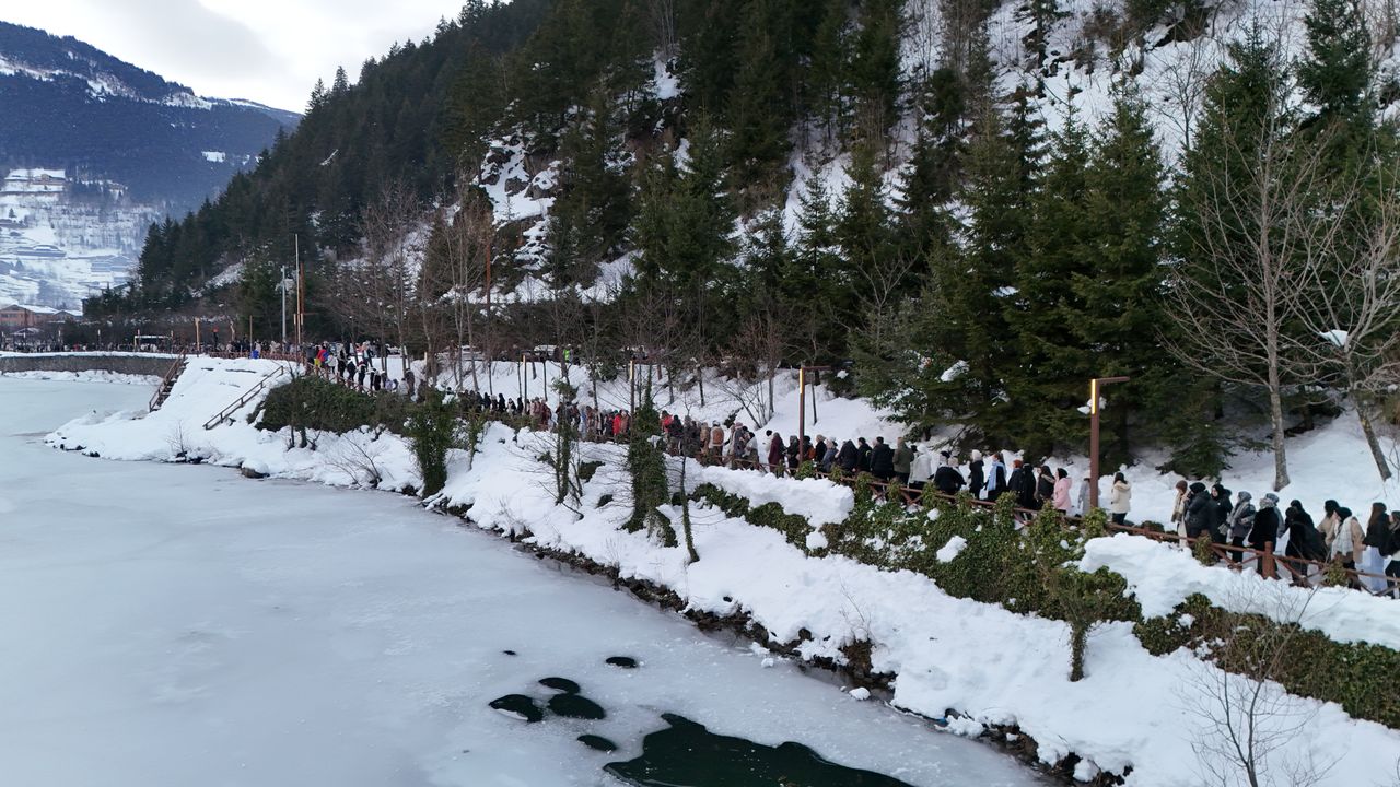 Trabzon'da süren Uzungöl Kış Festivali kapsamında düzenlenen etkinlikte, el ele tutuşarak buz tutan Uzungöl'ün etrafında, yaklaşık 2 kilometre uzunluğunda horon halkası oluşturanlar, dronla görüntülendi. Karla kaplı doğa manzarası eşliğinde düzenlenen horon etkinliği, katılımcılardan büyük ilgi gördü. Soğuk havaya rağmen ritimden kopmayan vatandaşlar, unutulmaz anlar yaşadı. Horon halkasına; Trabzon Valisi Tahir Şahin, Trabzon Büyükşehir Belediye Başkanı Ahmet Metin Genç, TBMM Bayındırlık, İmar, Ulaştırma ve Turizm Komisyonu Başkanı Adil Karaismailoğlu ve Çaykara Belediye Başkanı Hanefi Tok da katıldı. Kış festivali yarın da çeşitli etkinliklerle devam edecek. (DHA)