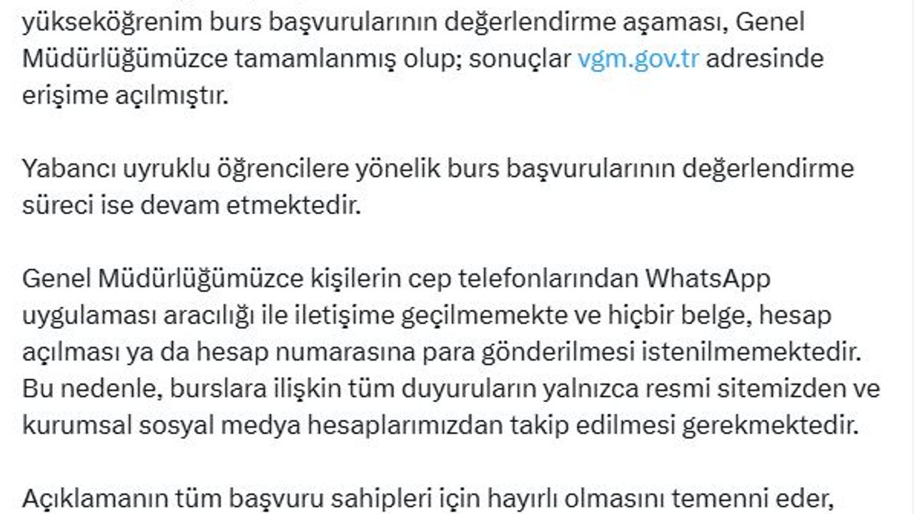 Vakıflar Genel Müdürlüğü'nün sosyal medya hesabından yapılan açıklamada, "Heyecanlı bekleyiş sona erdi. 2025-2026 eğitim yılı için 21-31 Ekim tarihleri arasında alınan yükseköğrenim burs başvurularının değerlendirme aşaması, Genel Müdürlüğümüzce tamamlanmış olup; sonuçlar http://vgm.gov.tr adresinde erişime açılmıştır. Yabancı uyruklu öğrencilere yönelik burs başvurularının değerlendirme süreci ise devam etmektedir. Genel Müdürlüğümüzce kişilerin cep telefonlarından WhatsApp uygulaması aracılığı ile iletişime geçilmemekte ve hiçbir belge, hesap açılması ya da hesap numarasına para gönderilmesi istenilmemektedir. Bu nedenle, burslara ilişkin tüm duyuruların yalnızca resmi sitemizden ve kurumsal sosyal medya hesaplarımızdan takip edilmesi gerekmektedir. Açıklamanın tüm başvuru sahipleri için hayırlı olmasını temenni eder, eğitim hayatlarında başarılar dileriz" denildi. (DHA)