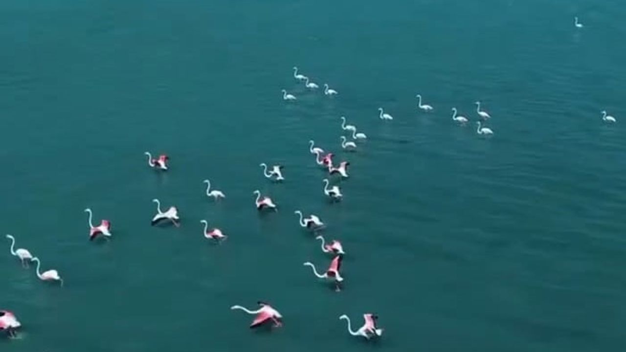 Gölde konaklayan flamingoların yaşam alanlarını kontrol eden ekipler, kaçak avcılıkla mücadele kapsamında dron desteği ile hem havadan hem de karada yoğun önlem alıyor. (DHA)