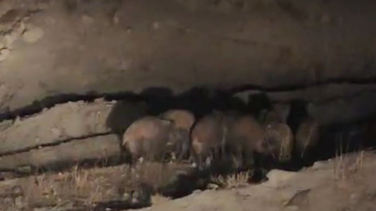 Başkale ilçesine bağlı Esenyamaç Mahallesi'ne, akşam saatlerinde yaban domuzu sürüsü indi. Mahalle'de yaşayan Mustafa Özdemir, yolun kenarında yiyecek arayan sürüyü, cep telefon kamerasıyla görüntüledi. Yaklaşık 10 domuzun bulunduğu sürü, yolun karşısına geçtikten sonra gözden kayboldu. (DHA)