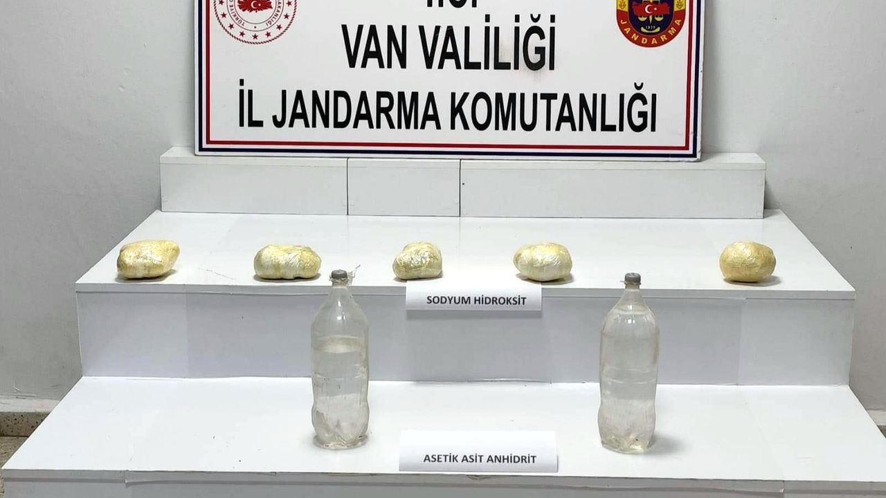 VAN, (DHA)- VAN'ın Başkale ilçesinde jandarmanın düzenlediği operasyonda, uyuşturucu yapımında kullanılan 4 kilo 580 gram asetik anhidrit ve 3 kilo 88 gram sodyum hidroksit ele geçirildi, 1 şüpheli gözaltına alındı.