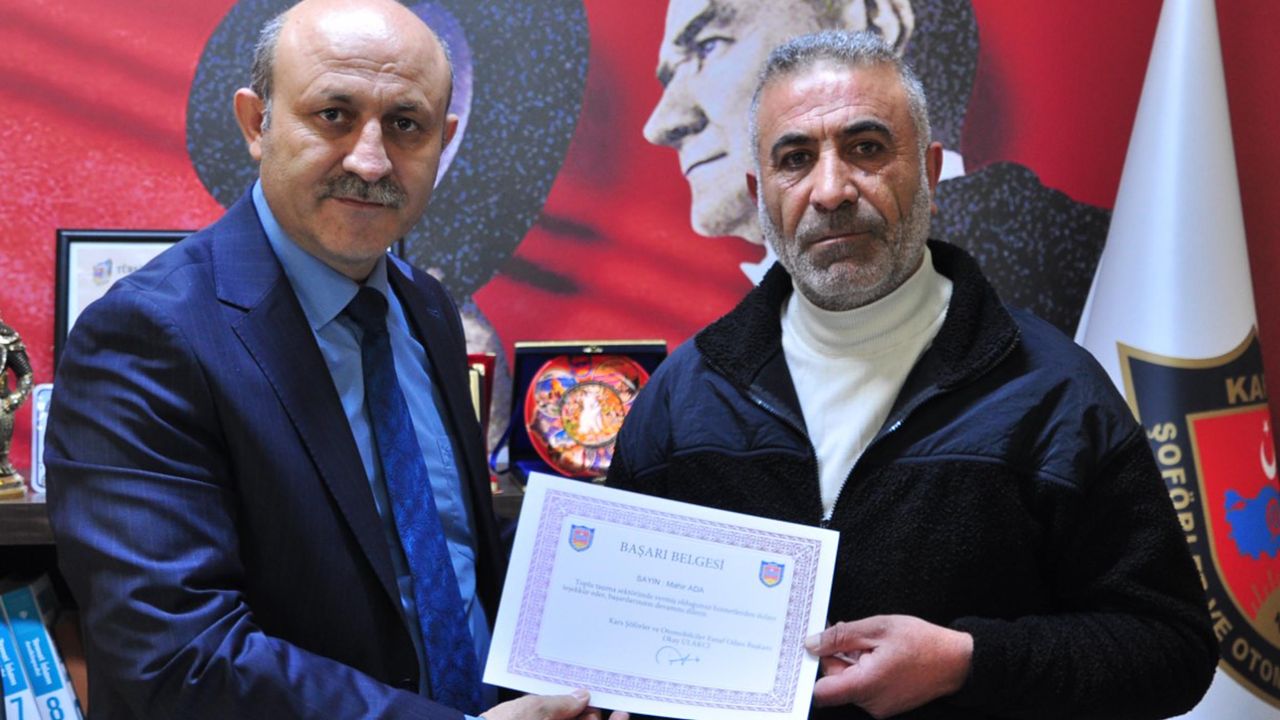 Volkan KARABAĞ/KARS, (DHA)- KARS'ta kalp krizi geçiren yolcuyu güzergahını değiştirip hastaneye yetiştiren minibüs sürücüsü Mahir Ada, Kars Şoförler ve Otomobilciler Odası Başkanı Okay Ulakcı tarafından plaket ve başarı belgesiyle ödüllendirildi.