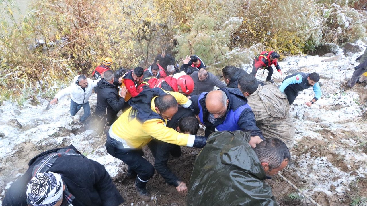 Mehmet ÖZKAN/HAKKARİ, (DHA)- HAKKARİ'de yağışların etkisiyle dağdan kopan kaya parçasından kurtulmak isteyen sürücünün manevra yaptığı kamyonet, yaklaşık 200 metre yükseklikten Zap Suyu’na yuvarlandı. Araçta sıkışan 4 kişiyi ekipler botlarla ulaşarak kurtardı.